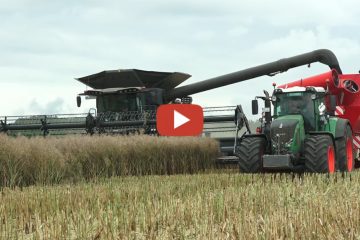 Ein Fendt Ideal 10T mit einem 12 Meter Fendt PowerFlow Schneidwerk bei der Rapernte 2023 — Stefan Lübke