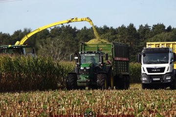 Landtechnik MV – Agricultural Videos — Agrarservice Nordost bei der Maissilage mit einem John Deere 9800i, für den Transport sind verschiedene John Deere Traktoren und MAN LKW im Einsatz. Auf dem Silo arbeiten ein John Deere 8320R und ein Fendt, beide mit Holaras Schiebeschild.