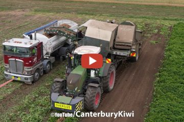 Canterbury Kiwi -Kartoffelernte in Canterbury Neuseeland mit einem Fendt Vario 828 und einem Lockwood Kartoffelvollernter. Die Kartoffeln werden auf Anhänger geladen, die von einem Fendt Vario 828 gezogen werden.