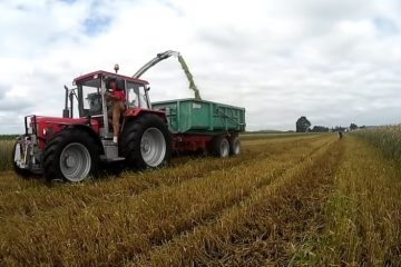 Claas Jaguar 990 mit 5 Massey Ferguson USA Abschiebewagen. Landmaschinen und Fahrzeuge!