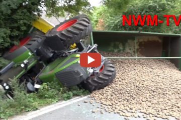 Spektakuläres Unfallbild: Traktorgespann mit 2 Anhänger kommt von der Straße ab — Tonnen von Kartoffeln ergießen sich auf der Straße –
