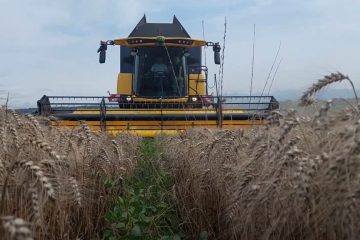 Bei Reto Minder aus Jeuss im Kanton Freiburg wird der Weizen aus der Staffelkulturkombination Winterweizen-Soja geerntet. die grüne