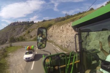 JOHN DEERE 9560 WTS auf einer schmalen Straße in den Bergen.