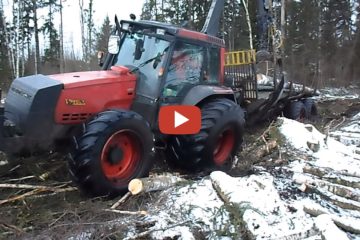 Nassen Winterwald mit Valtra Forsttraktor und Kronos-Anhänger — Arunas195