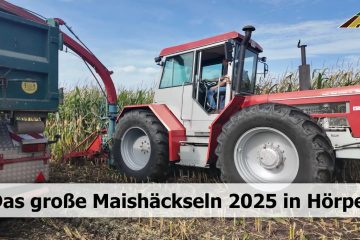 Das große Ü-30 Landmaschinen Treffen zum gemeinsamen Maishäckseln 2025. Mehr geht nicht, über 40 Abfahrgespannen, selbstfahrende Maishäcksler Fahr, Claas, angebaute Maishäcksler mit Schlüter und John Deere 2650 zusammen auf einem 20 ha Maisfeld in der Lüneburger Heide. AgrarBlick