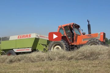 Ballen pressen mit einem Fiat 1580 DT und einem Claas Quadrant 1200. Transport mit John Deere 6400 und New Holland TD85D