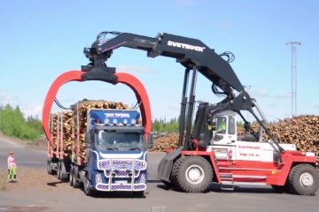 Svetruck TMF 28-21 unloading Volvo FH12 6×2 Timber Truck