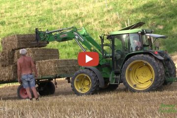 Berner Landtechnik 2022 Im leicht abschüssigem Gelände werden die Quaderballen mit unserem John Deere 6210 mit Zwillingsbereifung vorne und hinten zusammengetragen