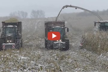 Maisernte im Schnee 2021 Ein Claas Jaguar bei winterlichen Verhältnissen im letzten Zweitfrucht Mais unterwegs. 3 Fendt Traktoren und ein John Deere 7R dienten als Abfahrer. — Agrartechnik im Einsatz – Agriculture Videos