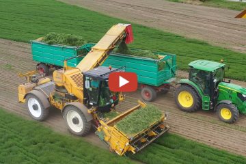AgrarBlick 2020 – Das Bohnenkraut wird vor und während der Blüte geerntet. Eine spezielle Erntemaschine Typ Oxbo ist hier mit zwei John Deere Abfahrgespanne im Einsatz.