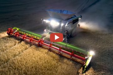 Wintergerste 2023 — Ein Claas Lexion 8800 mit 12,30m breitem Covio Flex Schneidwerk, begleitet von einem Massey Ferguson mit Fuhrmann Überladewagen, beim Gerste dreschen in den späten Abendstunden im Weinviertel. — Weinviertler Agrarvideos