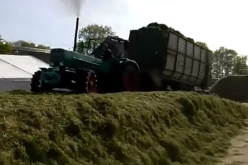 Fendt Favorit 10 SA mit Bergmann Ladewagen bezwingt den Silo.