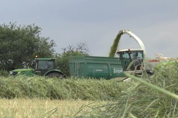 Ein Claas Jaguar 990 Feldhäcksler mit einem 12 Reiher Claas Orbis 900 bei der Maisernte 2025. Claas Xerion 5000 + 4200 und John Deere Traktoren. Stefan Lübke