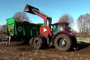 Trecker Marc 2023 – Ausbringen von Kompost ist ein Valtra T 255 mit Stoll Profiline FZ 48-33 Frontlader und Tebbe HS 220 Tandem – Streuer
