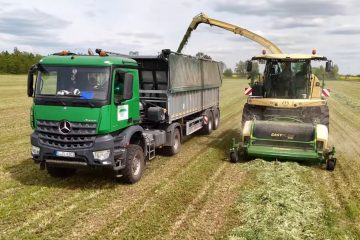 Ein Krone Big X 1180 mit einer Maximalleistung von 1156 PS beim Luzerne häckseln 2025. Für Gras/ Luzerne werden aber die hälfte der Zylinder abgeschaltet, da nur die halbe Leistung benötigt wird. Stefan Lübke